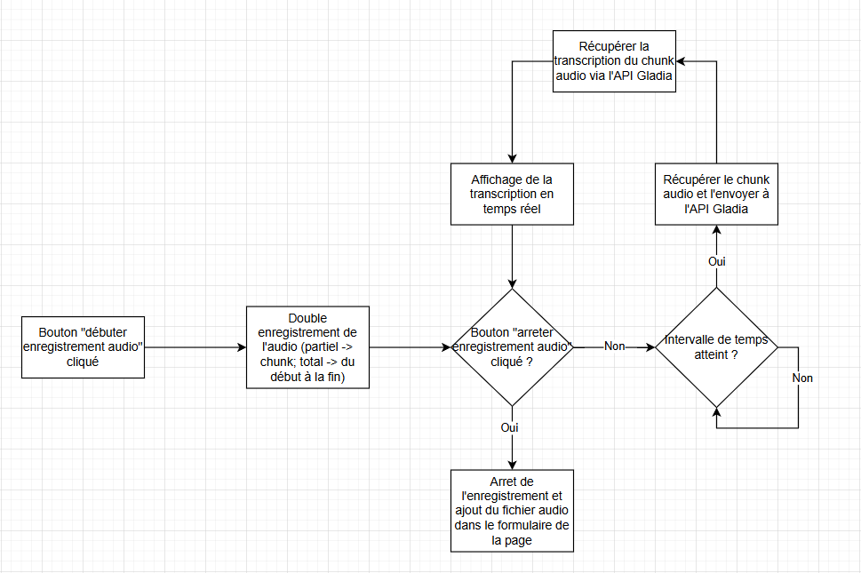 La transcription devant être fait en temps quasi réel, nous devions donc envoyer des chunks audio à intervalle régulier vers l'API Gladia afin de pouvoir par la suite récupérer la transcription et l'afficher à l'utilisateur.